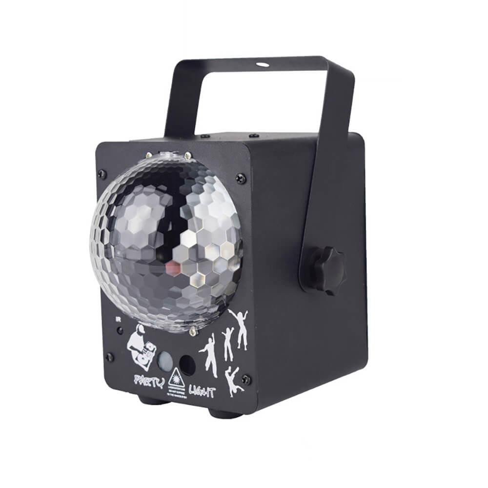 Лазерный проектор - дискошар музыкальный Party Light Box с пультом (RGB laser, LED, 120°) – полезное оборудование для дискотеки или вечеринки. Дискошар проектор светодиодный оснащен чувствительным датчиком звука, который улавливает мелодии и подстраивает под них подсветку в автоматическом режиме. Также режим можно выставить вручную с пульта управления. Светодиодный LED диско шар оснащен двумя мощными лазерами с углом наклона 120 градусов, которые охватывают помещение площадью до 50 кв.м. Световая установка-диско-шар выполнена из металла, поэтому корпусу не страшны падения и удары. На корпусе есть удобная ручка, за которую диско-шар можно подвесить или переносить.